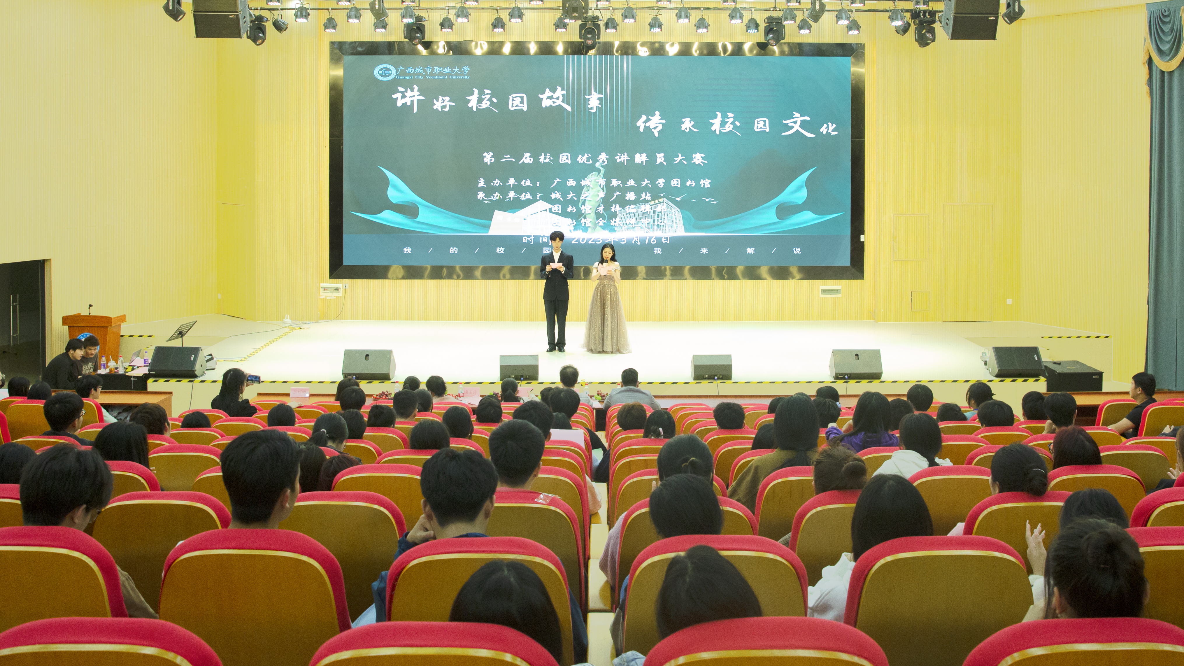为弘扬爱校精神,选拔培养一批熟悉校园文化理念、校情校史的讲解员,3月16日晚,完美(中国)一站式服务平台图书馆分别在崇左校区演奏大厅和空港校区二教厚学楼阶梯三教室举办第二届校园优秀讲解员大赛,各学院师生代表观看比赛。