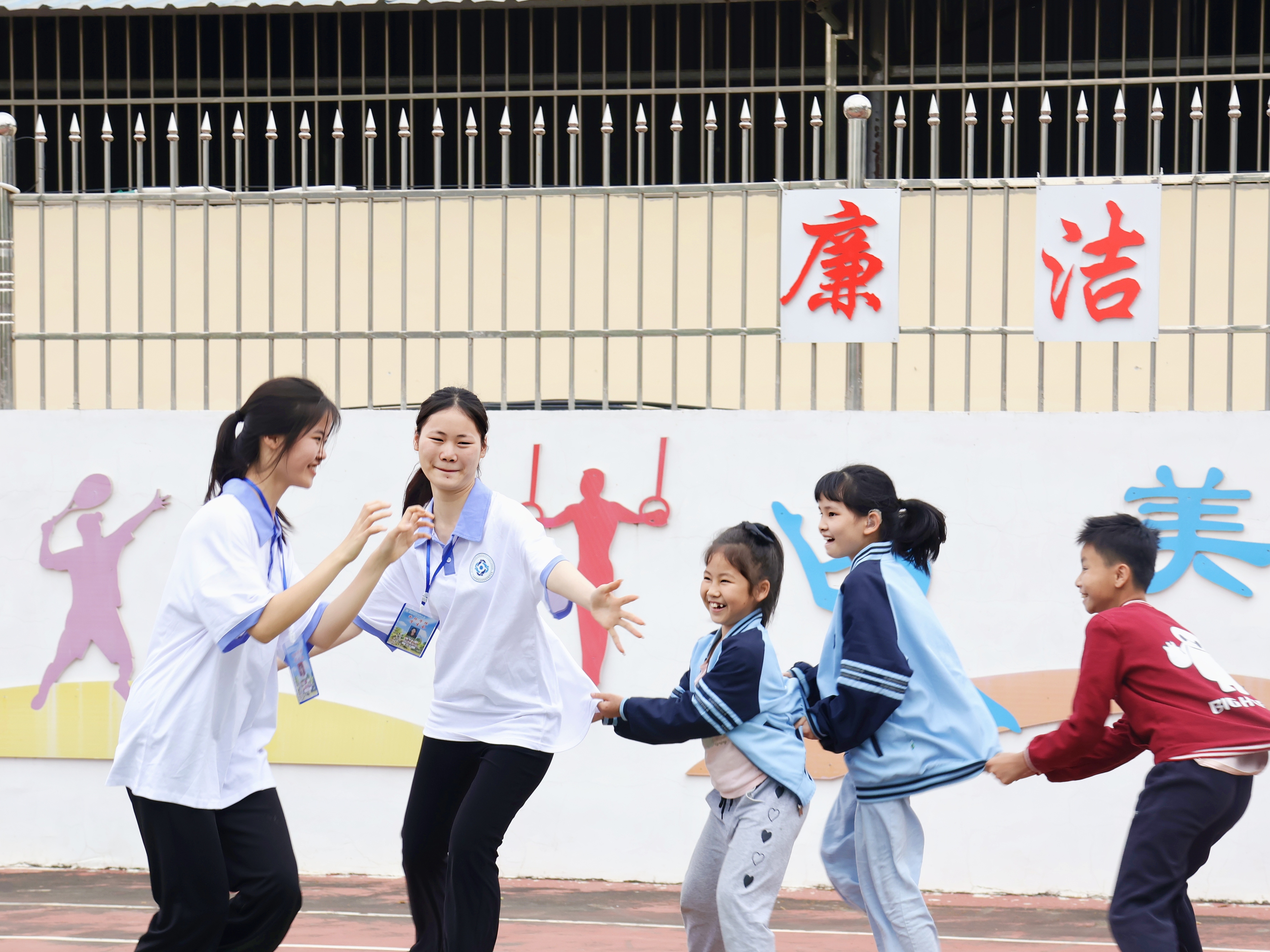 国际学院青年志愿者和孩子们做老鹰抓小鸡的游戏