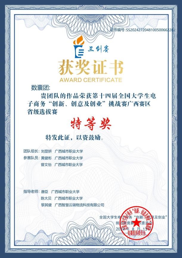 全国大学生电子商务“创新、创意及创业”挑战赛全国总决赛二等奖1项、广西赛区省级选拔赛特等奖1项;中华职业教育创新创业大赛金奖1项、银奖2项、铜奖2项;中国国际“互联网+”大学生创新创业大赛广西赛区银奖2项、铜奖13项、最具人气奖1项;“挑战杯”广西大学生创业计划竞赛银奖2项、铜奖4项;全国供应链大赛一等奖1项、二等奖2项;全国工业经济应用创新职业技能竞赛供应链管理师赛项省赛一等奖1项;OCALE全国跨境电商创新创业能力大赛团队“特等奖”14项。