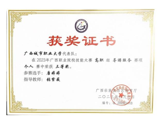 (1)学生参加历届广西职业院校技能大赛高职组导游服务赛项,累计获得二等奖1项,三等奖12项。