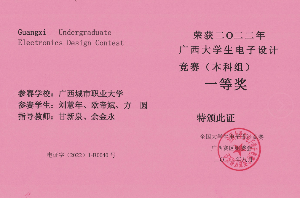 近年来,本专业教师曾指导学生参加第二十四届中国机器人及人工智能大赛、广西大学生电子设计大赛、广西职业院校技能大赛等各级竞赛获奖共计4项,其中国家级1项,自治区级2项,行业企业比赛1项。